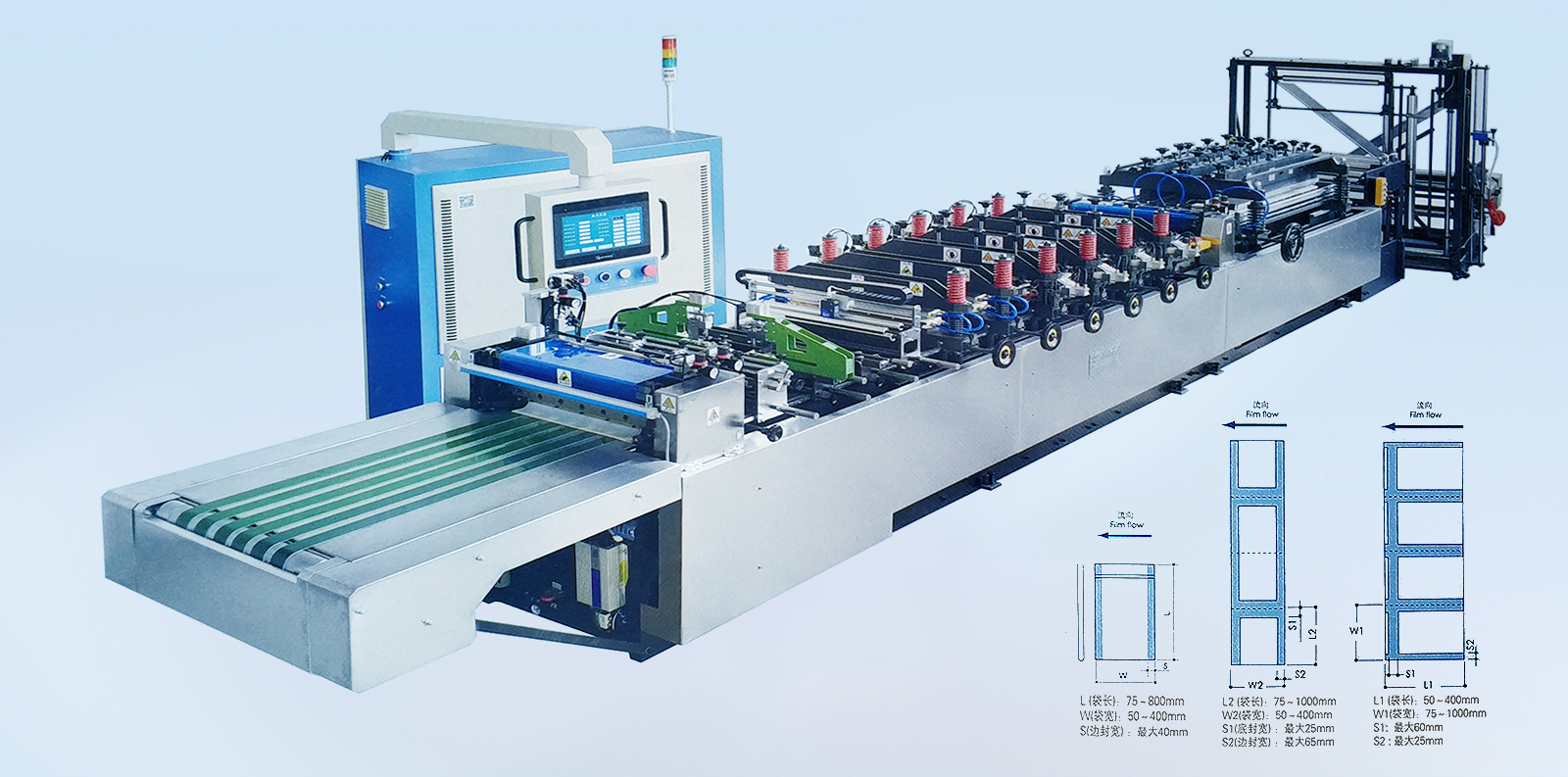 材料:各種復(fù)合薄膜。 卷筒:寬度≤1200mm,直徑≤800mm。 制袋速度:180段/分(機(jī)械設(shè)計(jì)速度)約<40m/min。 制袋寬度:≤500mm。 制袋長(zhǎng)度:50-400mm,制袋長(zhǎng)度超過(guò)400mm 以上應(yīng)采用倍送功能。